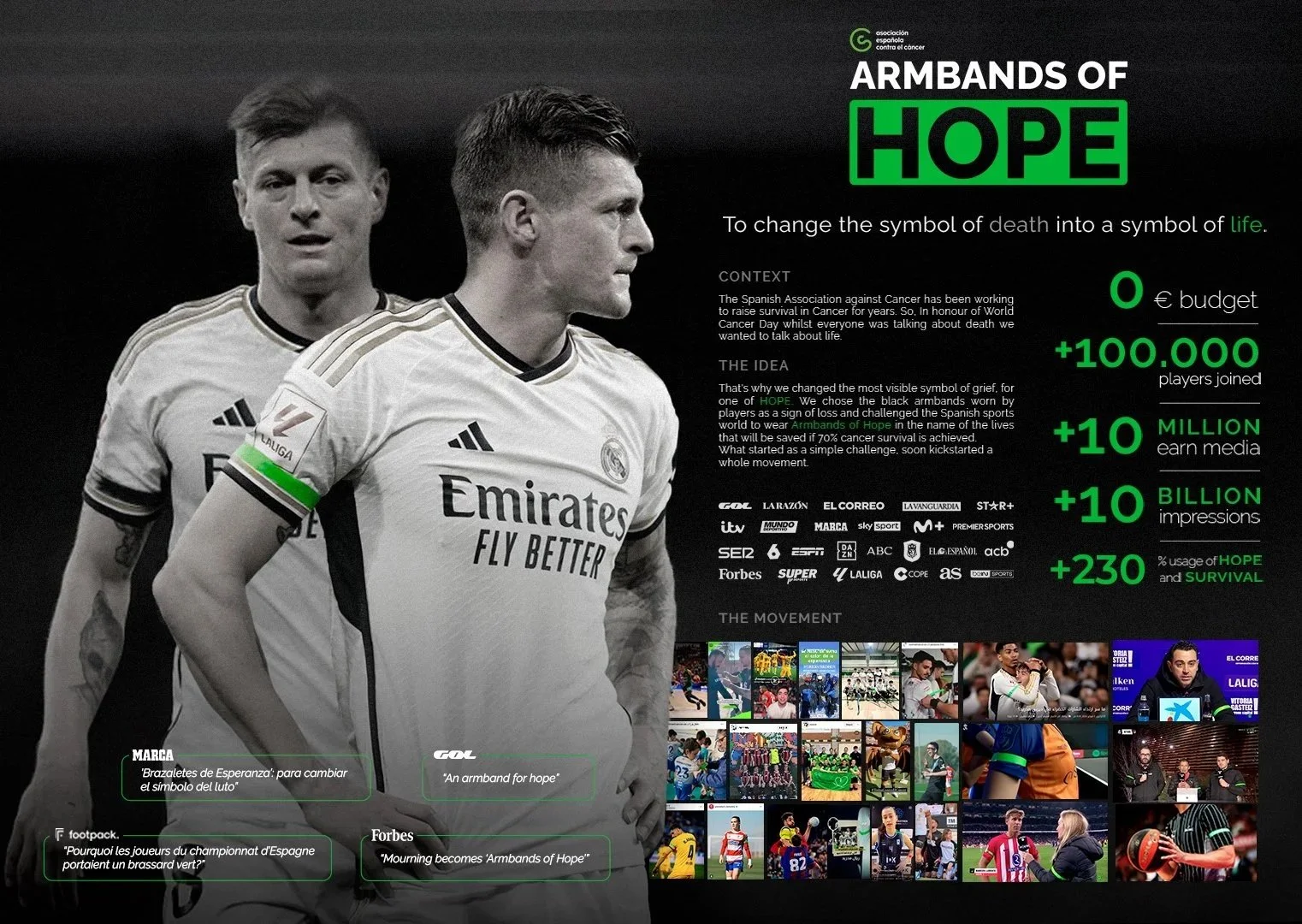 La iniciativa contó con el apoyo de LaLiga, la Liga ACB, Liga ASOBAL, asi como la Kings/Queens league y federaciones amateurs. Más de 100.000 deportistas llevaron el brazalete, convirtiendo la campaña en la más exitosa de la AECC (con el menor presupuesto). Desde entonces, cada 4 de febrero los estadios de todo el país se llenan de esperanza.