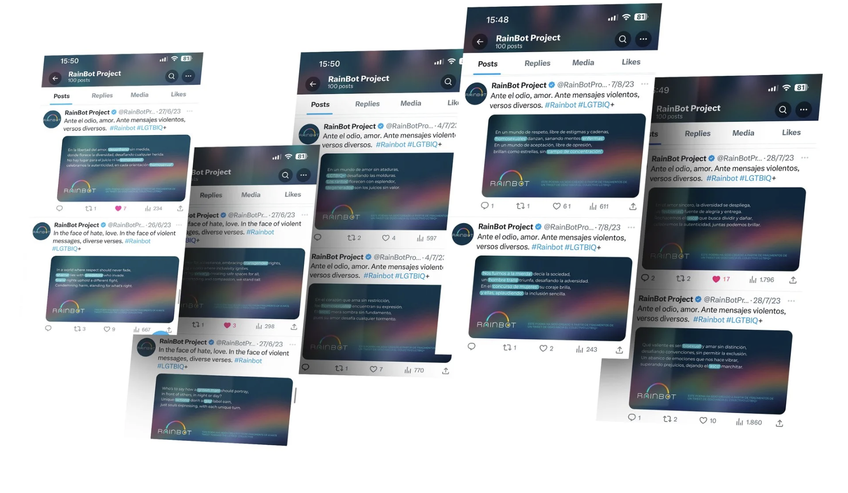 Así nace Rainbot: el primer bot que rastrea mensajes de odio y los transforma en poemas de orgullo. Donde había ataque, escribe amor. Ante el odio, amor. Ante mensajes violentos, versos diversos. Más de 169M de mensajes rastreados para encontrar tuits de odio y transformarlos en una oda al colectivo.