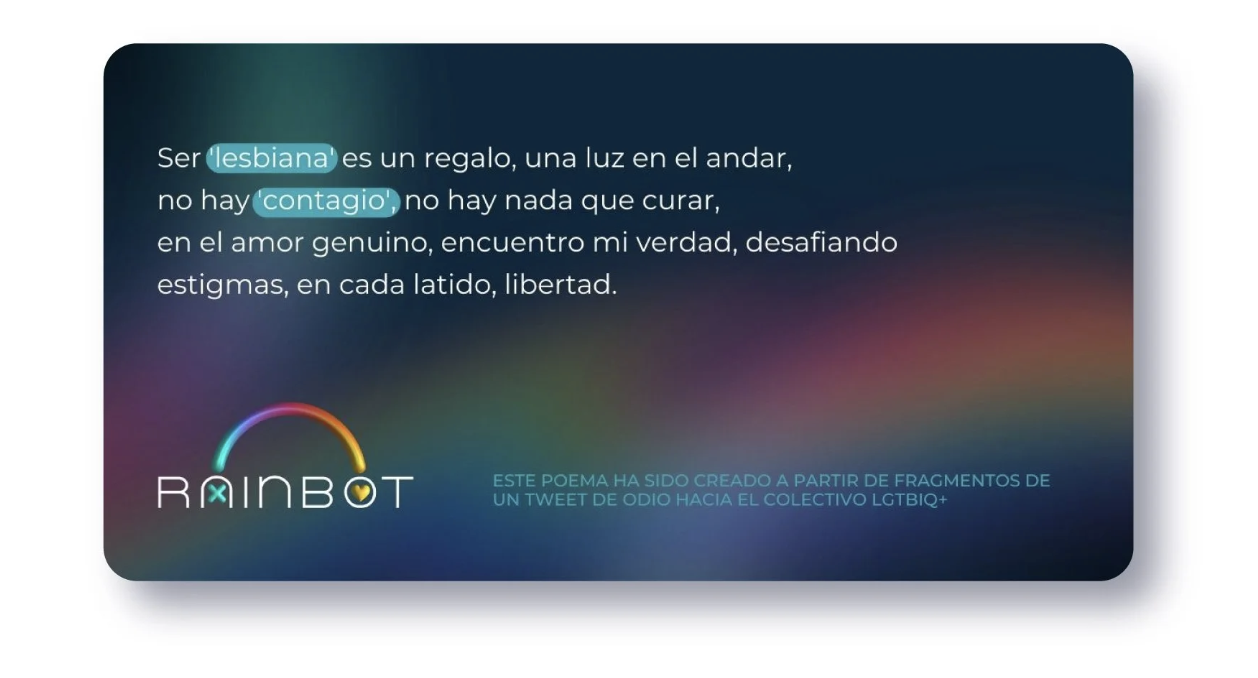 De la mano de una IA generativa, Rainbot detecta las palabras hirientes y las transforma en breves poemas de apoyo para el colectivo.